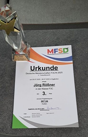 Jörg Rößner F3C Europameister von 1996 und Deutscher F3C Meister von 1997 fliegt und stellt sich seit ein paar Jahren wieder in der Deutschen F3C Meisterschaft den Herausforderungen und das mit Erfolg. Ein 2. (Göttingen) und 3. Platz (Egglkofen) im Jahr 2025 steht auf seinem Konto und das mit der LD-System Genesis-HCB-Mechanik und dem neuen LD-System FAI Rotorkopf.